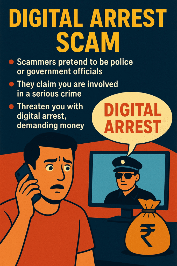 यह एक ऑनलाइन फ्रॉड है जिसमें स्कैमर्स (धोखेबाज़) पुलिस, CBI, कोर्ट या किसी सरकारी एजेंसी के अफ़सर बनकर लोगों को डराते हैं।