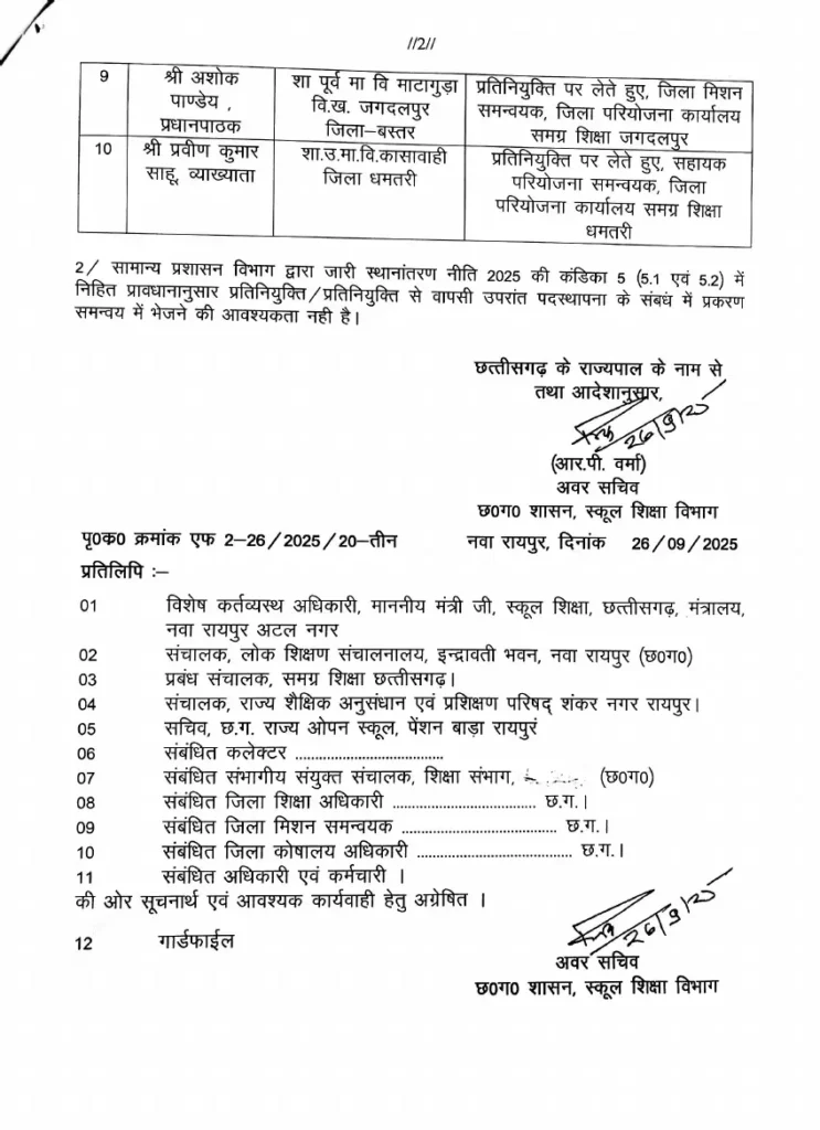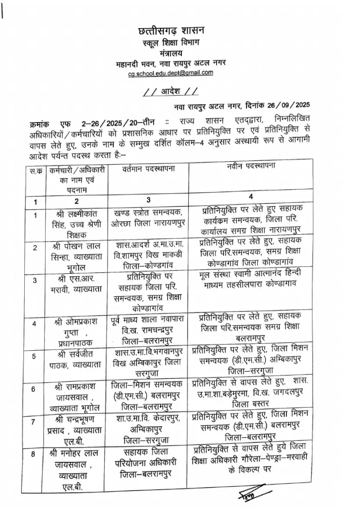 रायपुर: स्कूल शिक्षा विभाग में बड़े पैमाने पर तबादले किए गए हैं। प्रतिनियुक्ति पर कार्यरत 100 अधिकारियों का ट्रांसफर किया गया है। इस फेरबदल के तहत DMC, BRCC और APC जैसे महत्वपूर्ण पदों पर भी बदलाव किए गए हैं। इसके अलावा DIET, SCERT और CTE जैसे शैक्षणिक संस्थानों में भी अधिकारियों के स्थानांतरण किए गए हैं।नए स्कूल शिक्षा मंत्री के कार्यभार संभालने के बाद यह पहली बड़ी प्रशासनिक सर्जरी मानी जा रही है। विभाग की ओर से इस संबंध में अलग-अलग 10 आदेश जारी किए गए हैं, जिनके तहत यह तबादले अमल में लाए गए हैं।