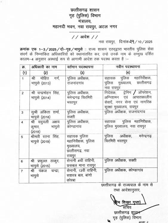 CG IPS Transfer News: छत्तीसगढ़ शासन ने सात आईपीएस ऑफिसर्स का ट्रांसफर किया है। इनमें चार जिलों के एसपी भी शामिल हैं। जारी आदेश के मुताबिक, आईपीएस अंकिता शर्मा को राजनांदगांव का एसपी बनाया गया है। वहीं पंकज चंद्रा को कोंडागांव, प्रफुल्ल ठाकुर को सक्ती और रतना सिंह को मनेंद्रगढ़-चिरमिरी-भरतपुर जिले के एसपी की जिम्मेदारी सौंपी गई है। राजनांदगांव एसपी मोहित गर्ग को एआईजी बनाकर पुलिस मुख्यालय भेजा गया है। चंद्रमोहन सिंह को निदेशक आपातकालीन सेवाएं की जिम्मेदारी दी गई है। यदुवली अक्षय सिदार सहायक पुलिस महानिरीक्षक बनाए गए हैं।