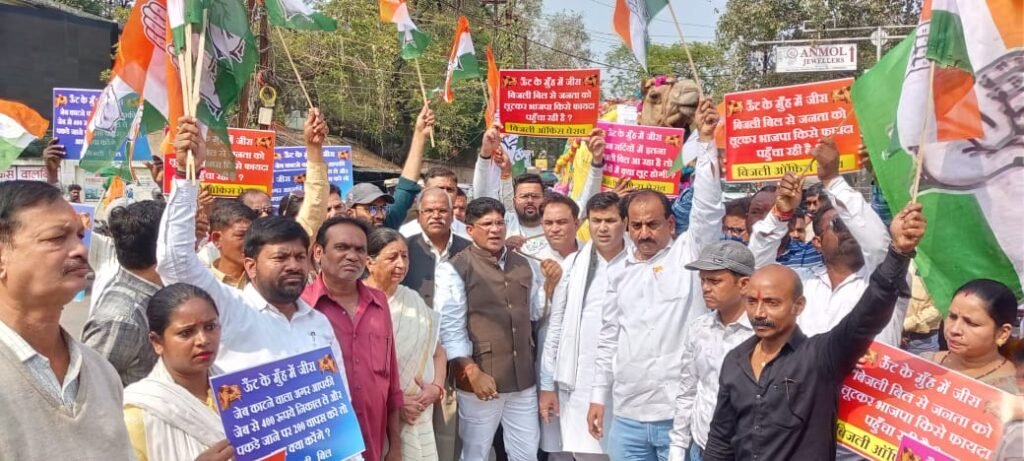 दुर्ग। जिला ग्रामीण कांग्रेस अध्यक्ष राकेश ठाकुर के नेतृत्व में आज जिला मुख्यालय के बिजली ऑफिस और कलेक्ट्रेट के सामने कांग्रेसियों ने ऊंट को जीरा खिलाकर बिजली बिल हॉफ योजना को 200 यूनिट करने का विरोध किया और पूर्व में कांग्रेस की सरकार की तरह 400 यूनिट करने की मांग की गई।