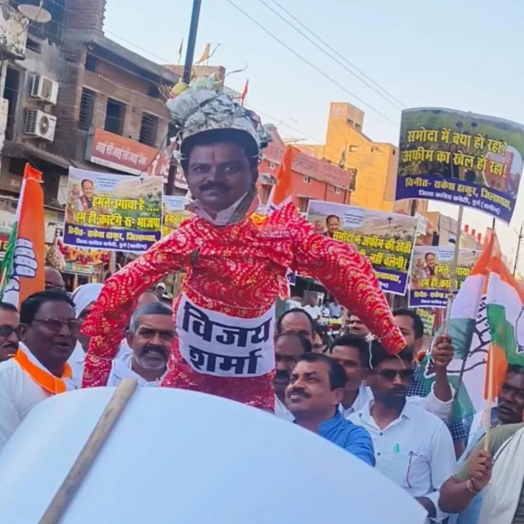 धमधा में विजय शर्मा का पुतला दहन, अफीम की खेती के खिलाफ कांग्रेस का विरोध प्रदर्शन